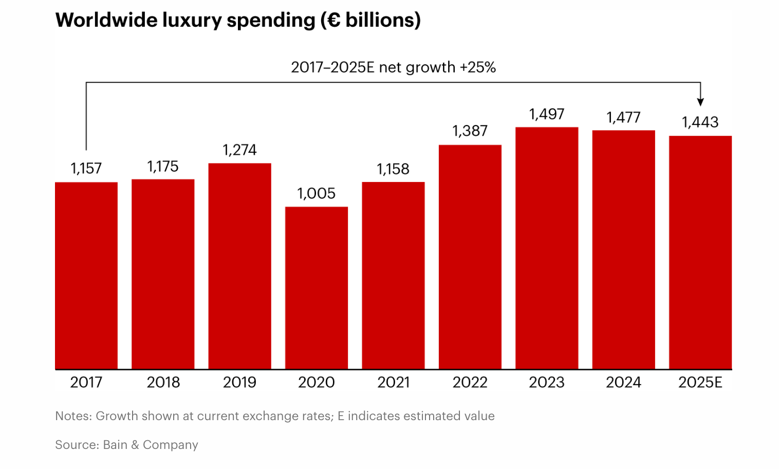 Between 2023 and 2025, the active personal luxury goods customer base moved from roughly 400 million to around 330 million. The addressable market remains. Wealth remains.